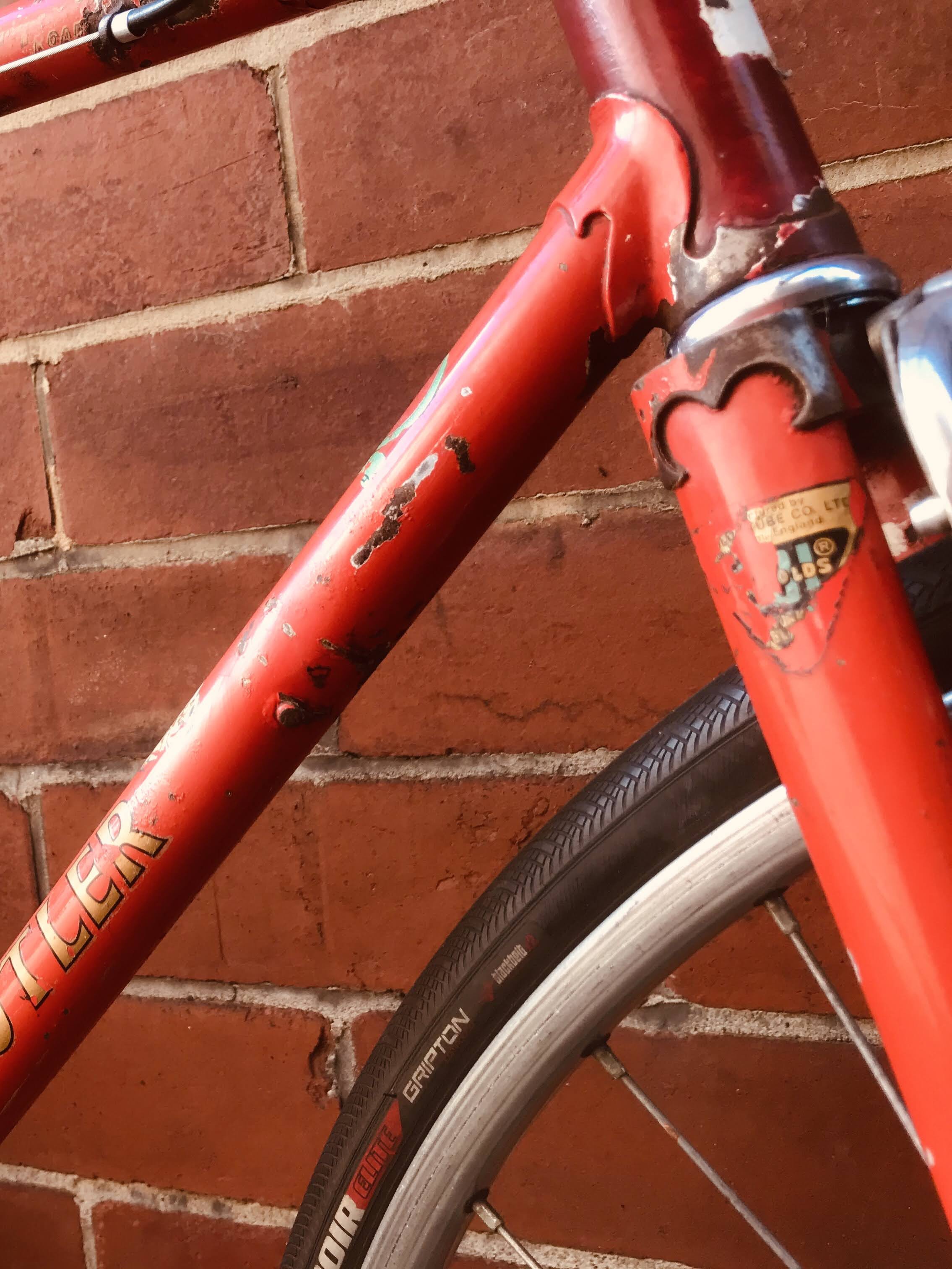 70s bike. Bought as a frame for a tenner. Built up as a rat bike or patina build from the parts bin. Single speed – dished the rear wheel myself which was a first. Quite a nice ride.
